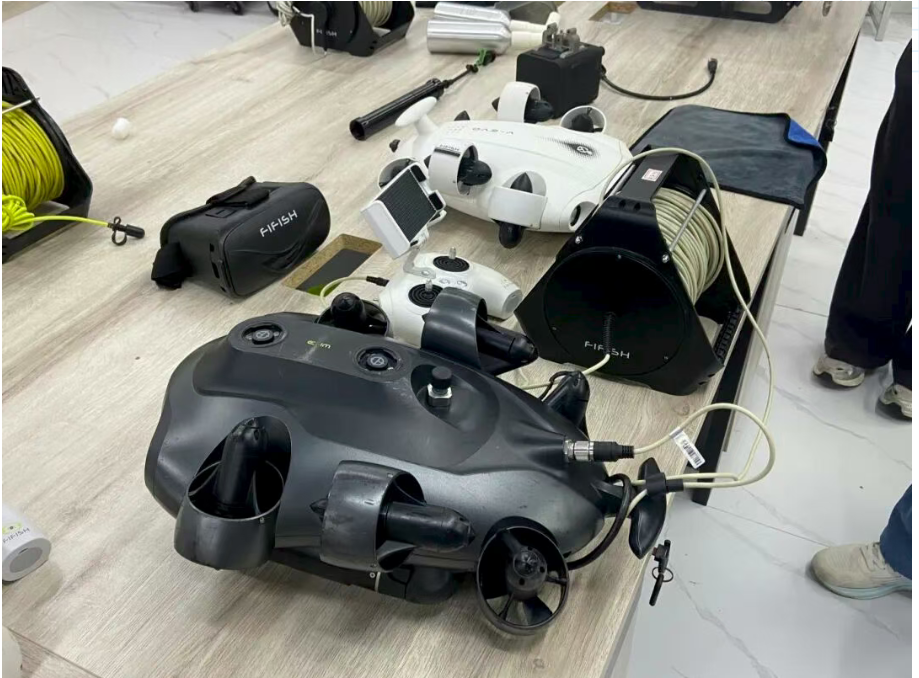 技术人员首先向社团成员详细介绍了FIFISH鳍源V-EVO水下无人机的各项特性。该设备配备6个推进器,能够实现360度全向运动,最大下潜深度可达100米。其4K高清摄像头和AI图像增强技术,可有效提升水下影像质量,满足各种复杂环境下的作业需求。