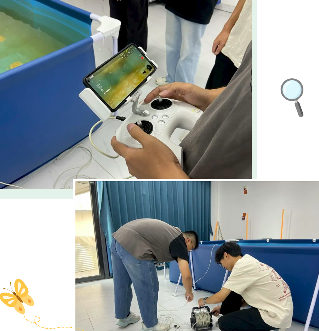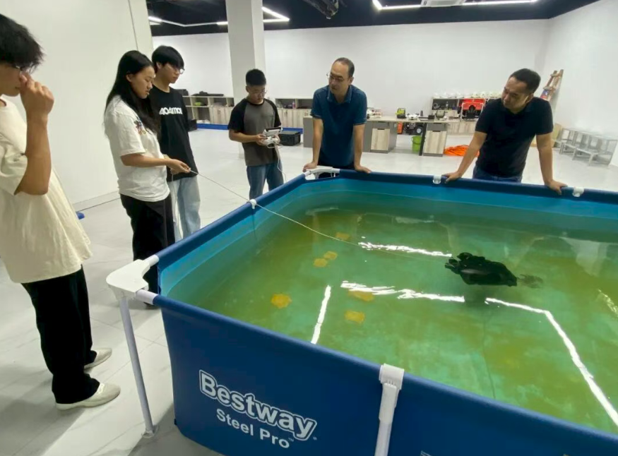 在测试水池中,社团成员轮流操作水下无人机,学习控制其运动轨迹和提升其作业能力。通过控制器屏幕,同学们可以实时观看无人机摄像头的拍摄画面,体验水下探索的乐趣。