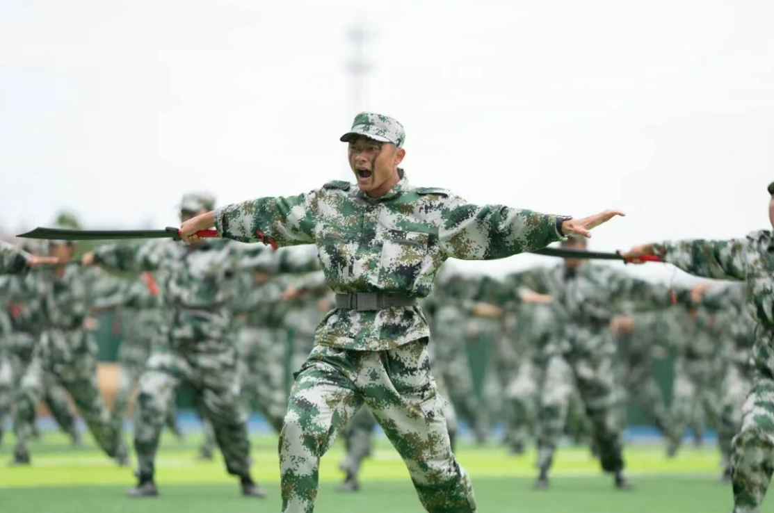 随着口号声响起,分列式方阵、拳术方阵、女子匕首操方阵、刺杀方阵、大刀方阵以及战术动作依次上演。新生们步伐铿锵如鼓点,身姿挺拔似青松,队列横平竖直、令行禁止,尽显军人风范与青春锐气,用坚毅的眼神和昂扬姿态证明:烈日下的磨砺、风雨中的坚持,已化作此刻最耀眼的青春勋章。