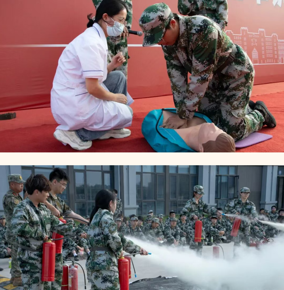 除常规训练外,此次同步开展特色活动提升新生综合素养,应急救护培训通过理论与实操,让新生掌握心肺复苏、创伤包扎等急救技能;消防演练则通过灭火器实操和火情疏散模拟,强化安全防护意识;5.31公里军训拉练以长途跋涉磨砺耐力与毅力。丰富内容让军训成为体能意志与知识技能双提升的成长课堂。