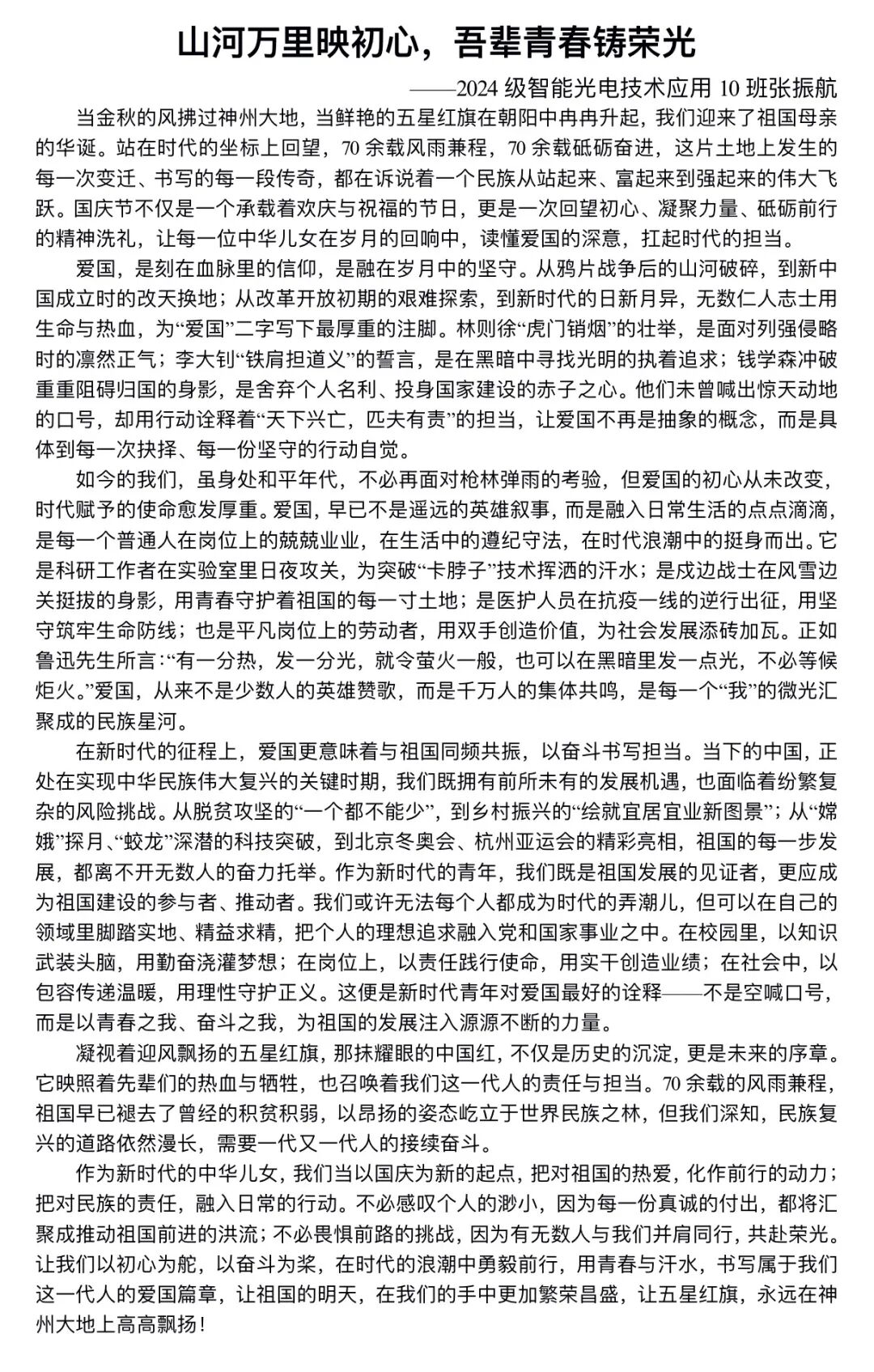 “用文字诉说对祖国的心意”活动收到众多未来学子的真挚稿件,字里行间满是对祖国科技发展的赞叹、对产业报国的憧憬,一篇篇佳作成为笔尖爱国情的生动注脚。