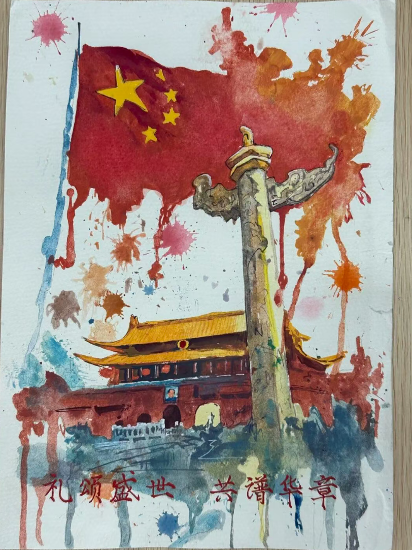 五彩画笔勾勒天安门,定格未来学子的爱国心;鲜活中国龙跃然纸上,与这份热爱相映成辉,尽显中华风采。这既是艺术创作,更是对“绘爱国底色”的诠释。