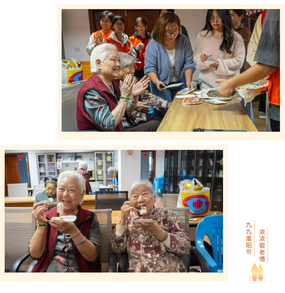 “匠心传情”环节中,志愿者们与颐养院工作人员一同制作重阳传统美食桂花糕,揉面、拌料、塑形、蒸制,大家分工协作,现场香气四溢。当香甜软糯的桂花糕新鲜出炉,老人们品尝着亲手参与制作的美食,脸上洋溢着幸福满足的笑容,浓浓的节日氛围在味蕾与心间蔓延。